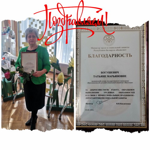 Благодарственным письмом Министерства труда и социальной защиты Республики Беларусь отмечена сотрудница нашего пансионата «Васильки» медицинская сестра Богушевич Татьяна Марьяновна. От всего коллектива благодарим за ваш труд и гордимся достижениями нашей коллеги! Благодарность от министерства — это высокая оценка вашей ответственности и доброты. Спасибо за ваш труд!