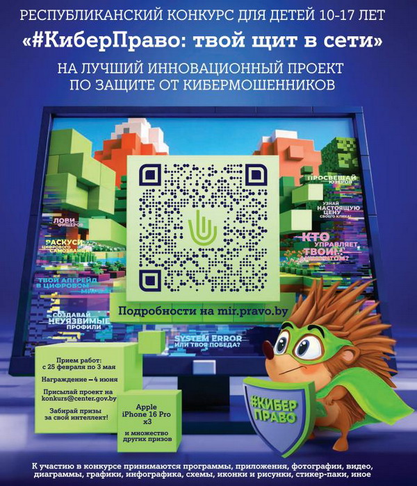 С целью принятия дополнительных мер, направленных на обучение детей цифровой грамотности, повышение уровня осведомленности подростков и их родителей о способах защиты от киберпреступлений, а также стимулирования к созданию собственных приложений или алгоритмов для защиты персональных данных, МВД совместно с Министерством образования, Национальным центром законодательства и правовой информации проводит республиканский конкурс для детей на лучший инновационный проект по защите от кибермошенников «#КиберПраво: твой щит в сети».